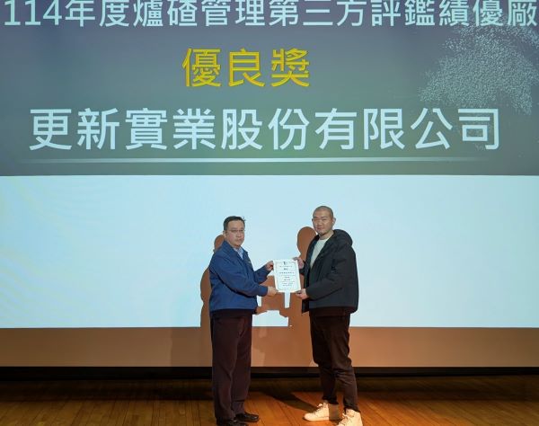 受邀出席「114年度爐碴管理第三方評鑑績優場表揚活動」,並獲頒「再利用處理廠優良獎」。此一殊榮不僅彰顯更新實業股份有限公司公司在爐碴管理制度、製程控管及環境保護作為上的卓越績效,更代表第三方專業機構與主管機關對我們的高度肯定。